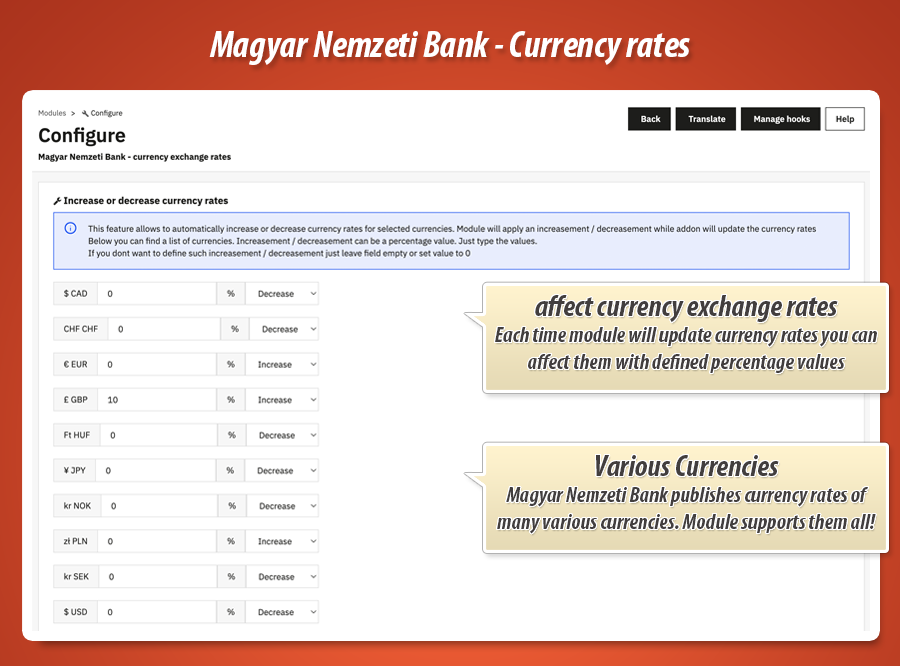 Secure the price stability of your PrestaShop store in the Central European market with an integrator that sources official exchange rates published by the Hungarian National Bank (Magyar Nemzeti Bank - MNB).