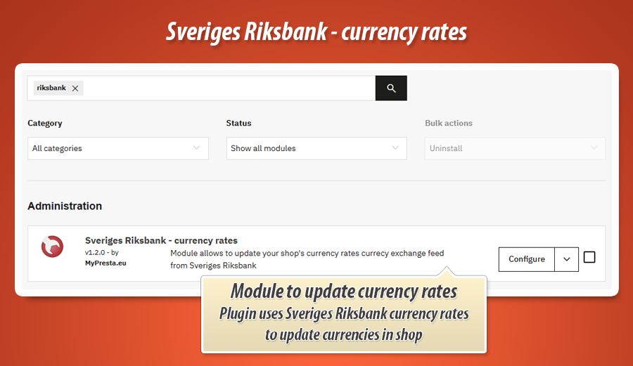 This module automatically updates your PrestaShop (1.6-9.x and newest) currency rates using the official feed from Sveriges Riksbank. Automate the process with a dedicated cron job URL. Protect your profits by setting custom margins (markup or markdown) individually for each currency.